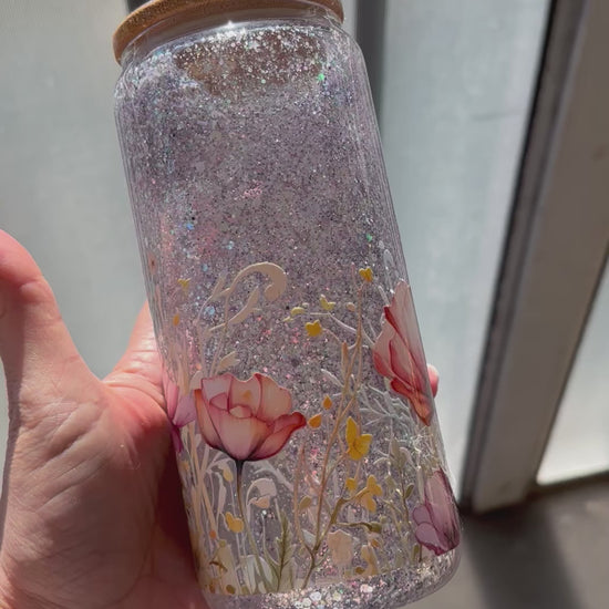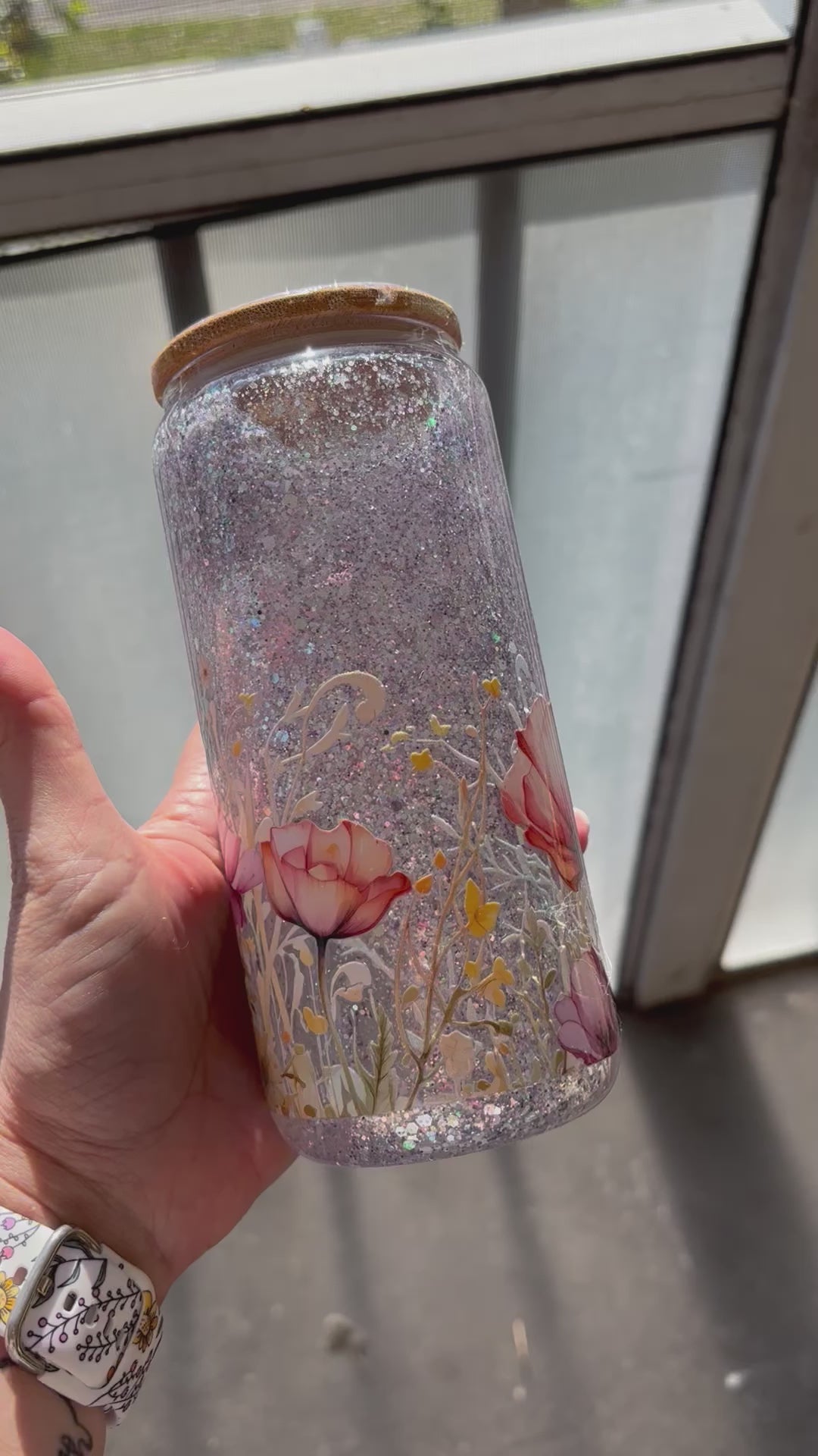 READY TO SHIP 16 oz Floral glitter snowglobe glass tumbler